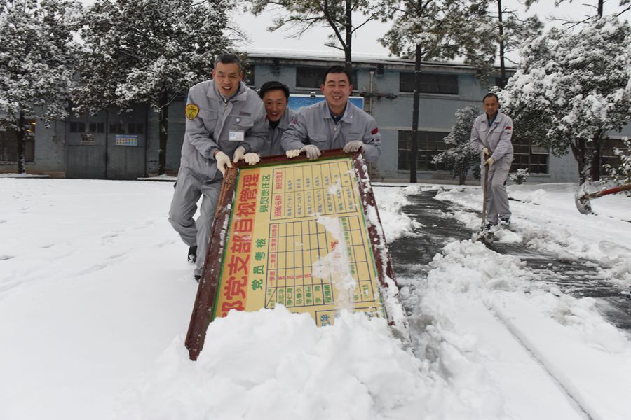 7點(diǎn)40分,雪落正酣,風(fēng)急刺骨。他們頂著凜冽的寒風(fēng)和紛飛的雪花,干勁十足地?fù)]舞著鐵鍬、笤帚和廢舊目視板,相互配合,鏟的鏟,掃的掃,推的推,一點(diǎn)點(diǎn)地把積雪和冰層鏟起集中堆放。經(jīng)過(guò)2個(gè)多小時(shí)熱火朝天地奮戰(zhàn),將模具、備料、清校、鍛一、柴油庫(kù)、成品庫(kù)等上下坡危險(xiǎn)路段和辦公樓、制造大樓、食堂旁邊的員工流動(dòng)集中路段打掃得干干凈凈。
